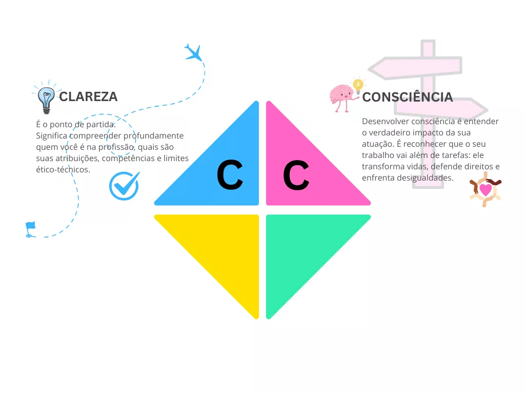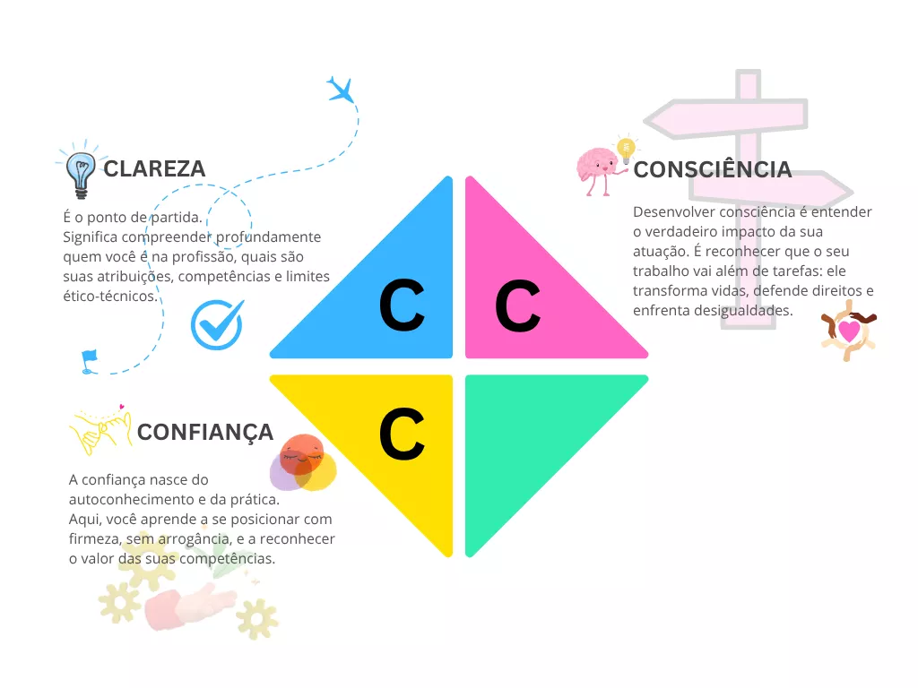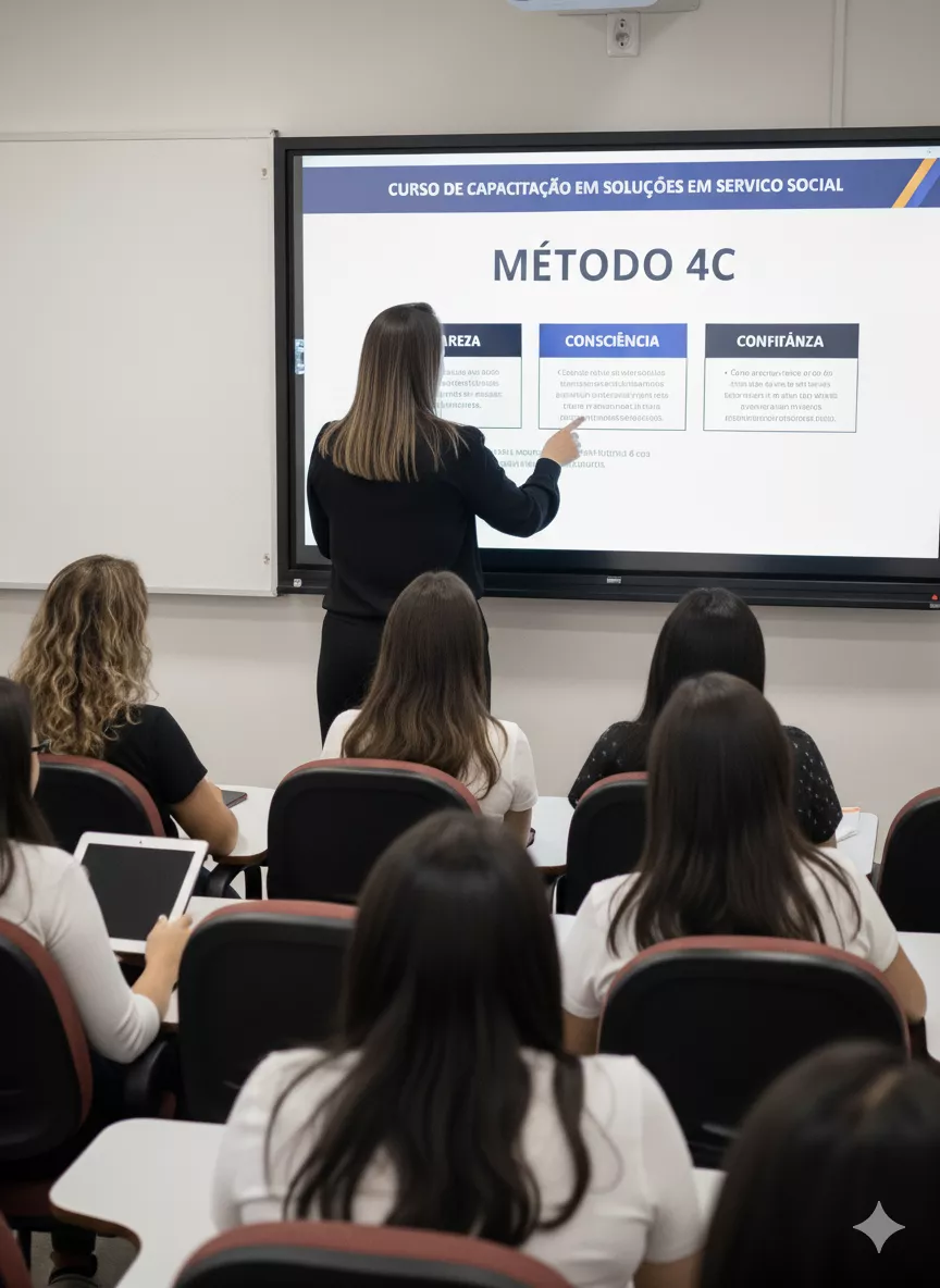 Pensando nisso, o Curso de Capacitação e Soluções em Serviço Social foi desenvolvido com uma metodologia estruturada em quatro eixos interligados — o Método 4C — que orienta a construção da sua identidade profissional e fortalece sua prática no campo do Serviço Social.