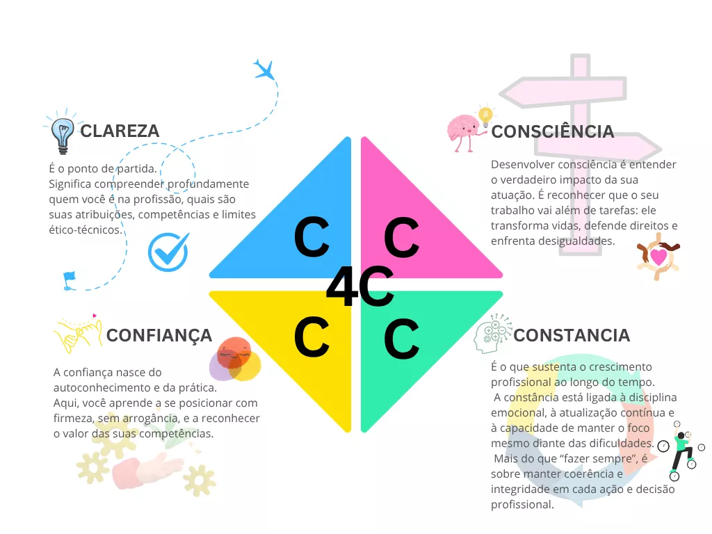 Foi a partir dessa realidade que desenvolvi o Método das 4C — Clareza, Consciência, Confiança e Constância, um sistema exclusivo que auxilia assistentes sociais e estudantes a superarem esses desafios, posicionando-se com segurança, clareza e assertividade no mercado de trabalho.